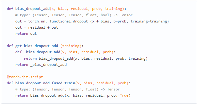 1. Использовать torch.jit.script. Такой простой атрибут приведёт к компиляции кода функции в одно ядро. В коде ниже как раз происходит фьюзинг трёх операций: сложения тензоров, dropout и ещё одного сложения тензоров.