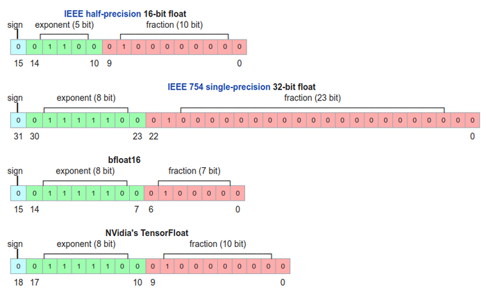 3. bfloat16 — ещё один 16-битный тип. По сравнению с fp16 мантисса на 3 бита меньше, а экспонента на 3 бита больше. Как итог — число может принимать больший диапазон значений, но страдает от потери точности при числовых операциях.