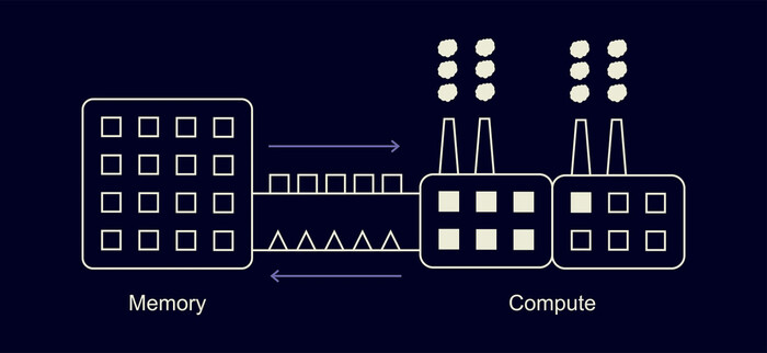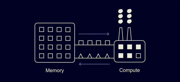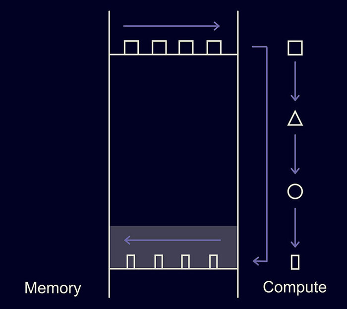 У GPU есть память — склад, и вычислитель — заводик. При выполнении одного ядра вычислитель заказывает из памяти нужные данные, вычисляет результат и записывает его обратно в память.