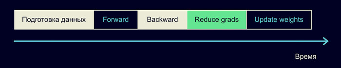 На этапе Reduce grads мы усредняем градиенты по видеокартам, чтобы объединить работу всех видеокарт, затем обновляем веса модели.
