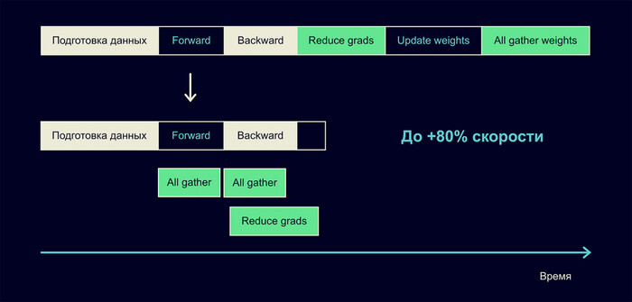 На наших запусках это дало прирост скорости 80%! Даже на маленьких моделях (размера 100M на 16 GPU) мы видели ускорение в 40-50%. Такой подход требует достаточно быстрой сети, но если она у вас есть, вы можете существенно ускорить обучение на нескольких GPU.