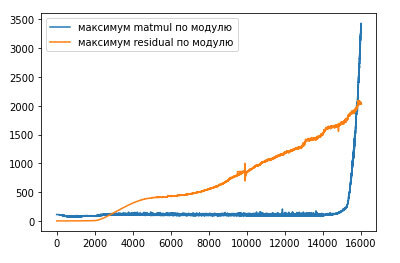 Хорошо видно: начиная примерно с 14 тысяч итераций максимумы matmul в attention резко стали расти. Этот рост — и есть причина расхождения. Если откатить обучение до 13 тысяч итераций и пропустить злополучные батчи, на которых расхождение началось, либо уменьшить learning rate, то можно существенно снизить вероятность повторного расхождения.