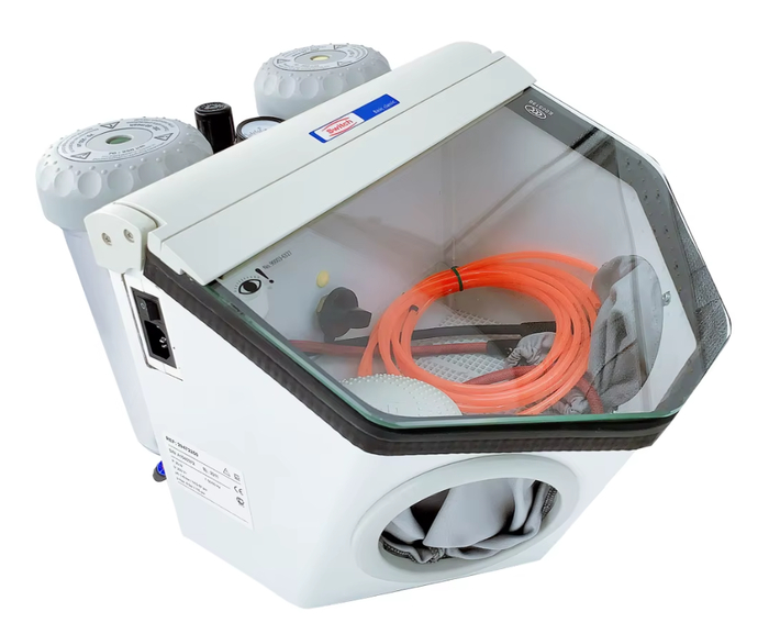 Компактный формат позволяет разместить оборудование на рабочем столе без перегрузки пространства. Аппарат обеспечивает контролируемую подачу абразива, что важно при работе с драгоценными металлами.