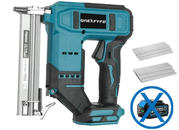 Профессиональный степлер с аккумулятором для забивания гвоздей и скоб. Работает без воздуха и проводов, идеально для отделки и сборки мебели.
