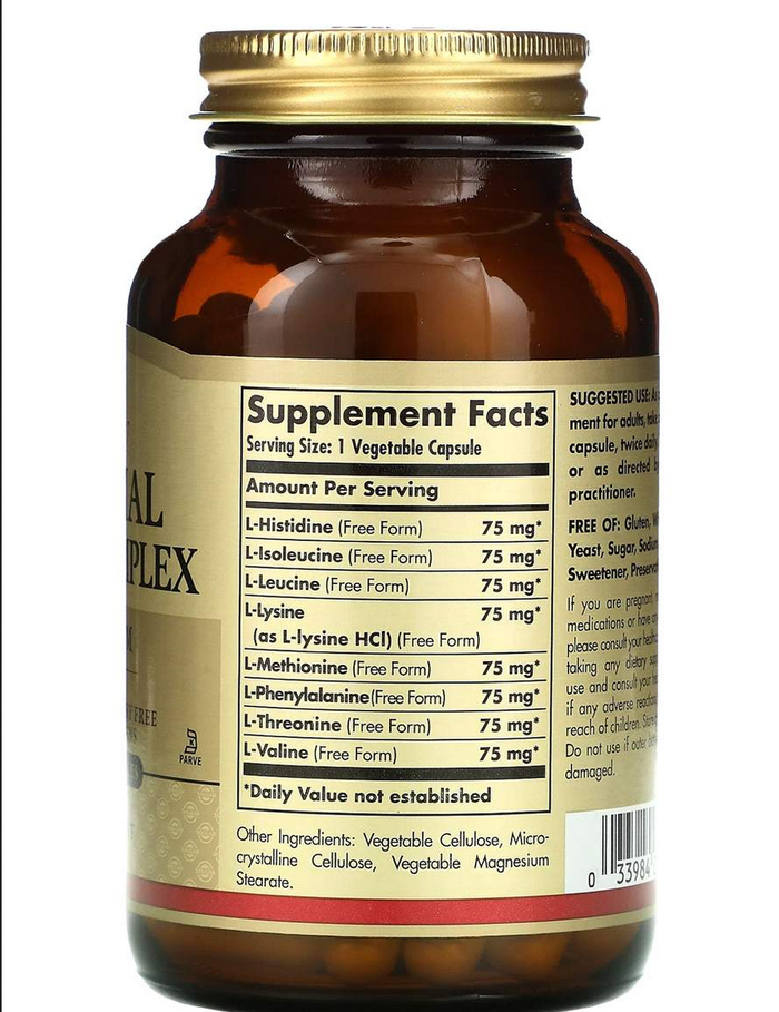 Теперь смотрю дозировки популярных препаратов. Самый популярный это Solgar "Essential Amino Complex", но дозировки у него искал долго. Нашёл.