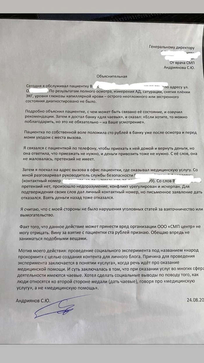 Уже через пару часов Андриянову позвонил гендиректор его «скорой» – на врача поступила жалоба с таким текстом: «после осмотра доктор достал банку для чаевых и сказал положить туда деньги. Скинулись всем офисом, кто сколько смог».