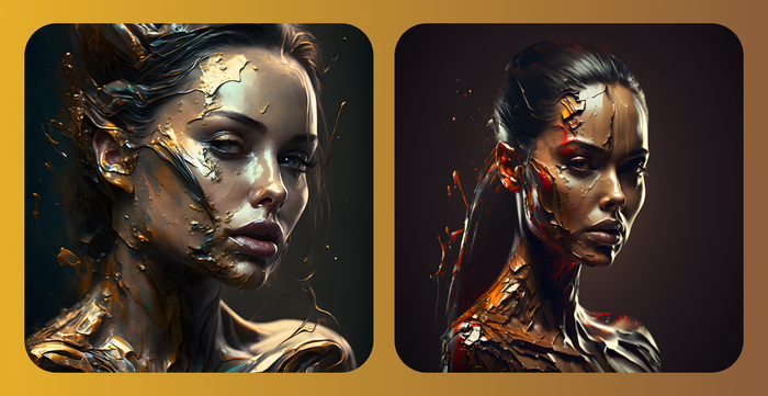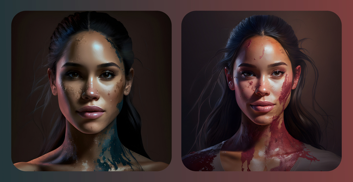 Prompt: [персонаж] covered in liquid paint, face paint, painted body, cinematic lighting, hyperrealistic, 3d rendering, character design