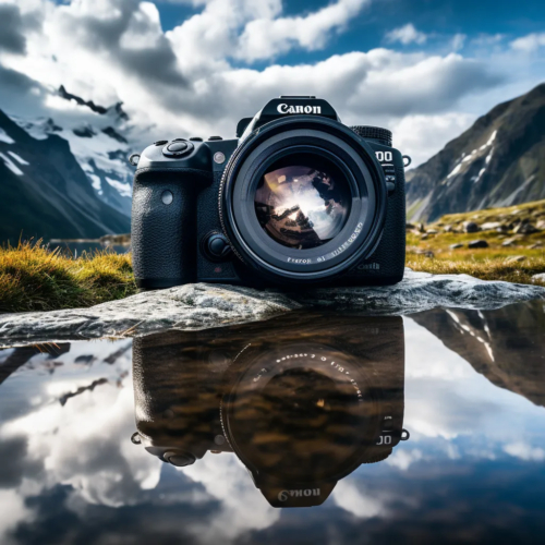 Промпт: a close-up shot of a DSLR camera being held by a professional photographer in a photography studio