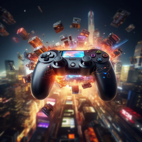 Промпт: a close-up shot of a video game controller being held by a gamer in a gaming den
