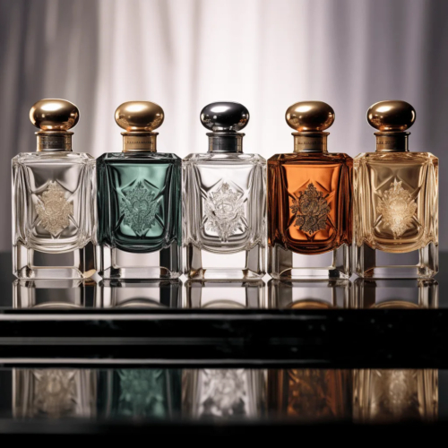 Промпт: low key product photography of a high-end fragrance bottle, highlighting the intricate glass details and deep amber liquid