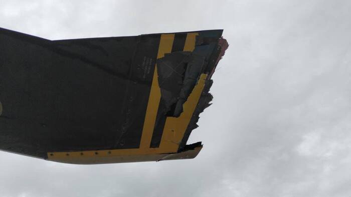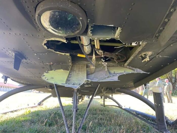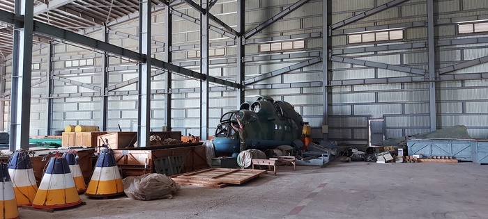 Он слетал на боевое применение (это когда вертолёт идёт с боевой нагрузкой). Ему не повезло, лётчик нервничал и на посадке угол тангажа превысил. Коснулся хвостовой балкой бетона ВПП.