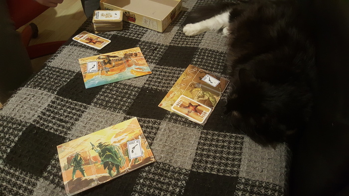 Поиграли в настольную ходилку, раздобыли шляпу и револьвер в шкафу - и поиграли еще и в Бэнг, привезенный гостем, таки пристрелив шерифа. Кот Бенедикт старательно играл с нами. Мы даже раздобыли ему фишку и давали катать кубик лапой в ходилке, где все зависело от бросков. Примерно в середине игры кот уснул и сдался, дальше играли втроем. А коша Нешта обжила рюкзак гостя и не хотела отдавать. Наверное, гость понравился.
