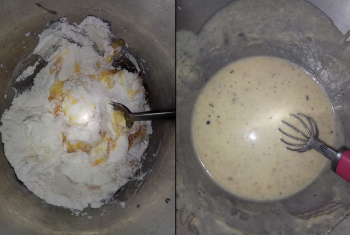 Таким образом, всё это тщательно перемешивается миксером в емкости до однородной взбитой массы и добавляется разрыхлитель.