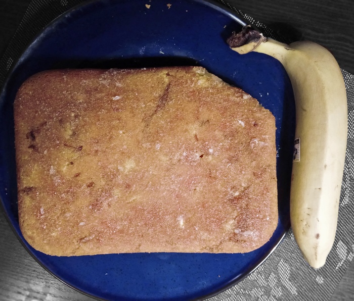 Готовится такой бисквит при температуре 180 °C примерно 30 мин. Также в плане вкуса можно импровизировать, например я обсыпал его сахарной пудрой и добавить цедру лимона. В общем из моей прямоугольной формы в итоге получился такой кусок сладкого хлеба (банан для масштаба).