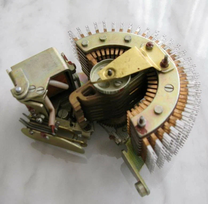 Внутри мы обнаружили хороший сетевой трансформатор, кучу реле и диковинный шаговый искатель: