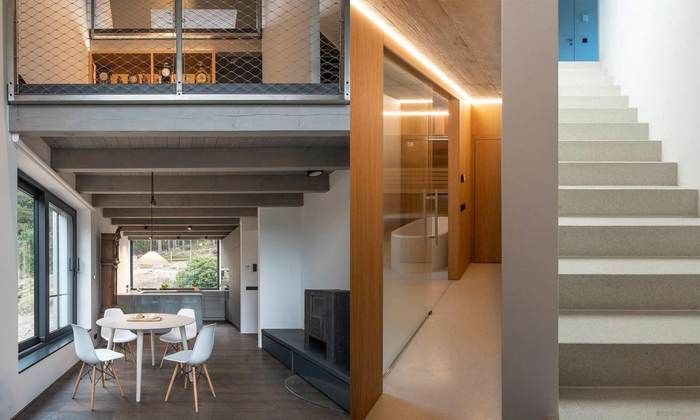 На окраине села, на склоне луга между зрелыми деревьями, был построен дом с фасадом из серого листового металла и крышей, через большие окна которой открывается прекрасный вид на окружающий пейзаж.