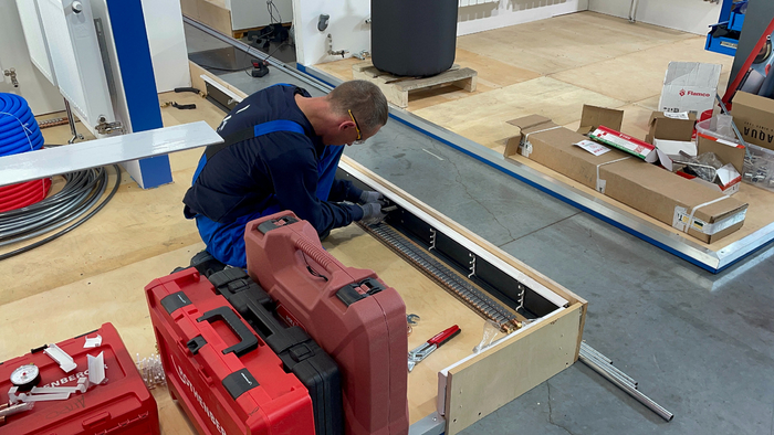 Пожалуй, самым непривычным для участников стал монтаж водяного теплого плинтуса, это пока еще редкое решение, поэтому не все с ним сталкивались в работе. Тем интереснее было наблюдать, как профессионалы решают малоизвестные им задачи. Теплый плинтус бывает и электрический, такой обычно устанавливают для обогрева лоджии.