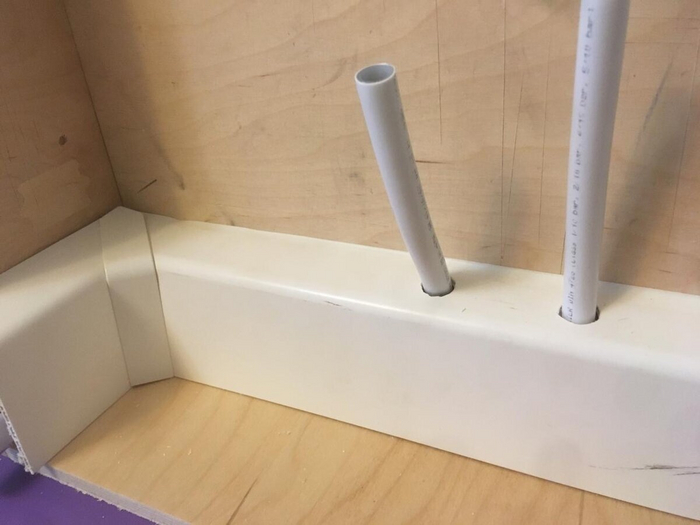 Так можно задекорировать отверстия с трубами. Это пластиковые накладки на трубы.