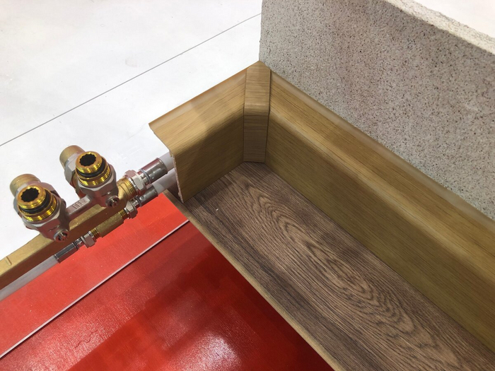 А здесь с металлопластиковыми трубами уже использован другой узел для выхода на радиатор. Тоже имеет право на существование, но ценник будет, разумеется, в несколько раз выше. И здесь применены плинтусы другой фактуры, конструкция и размеры одни, но цвет и фактура другие.