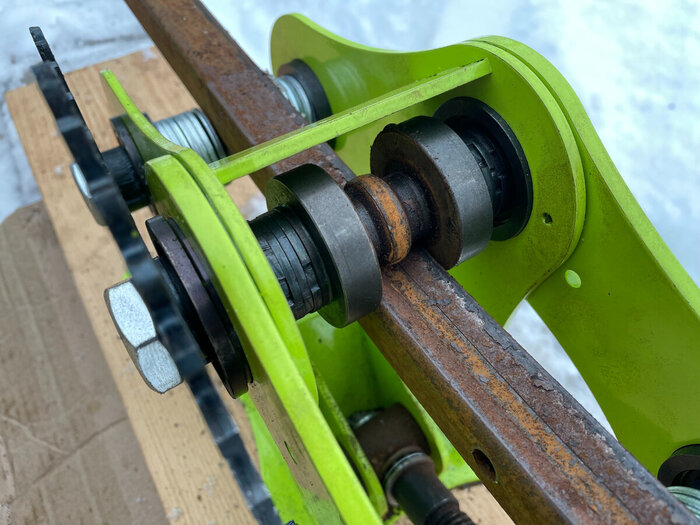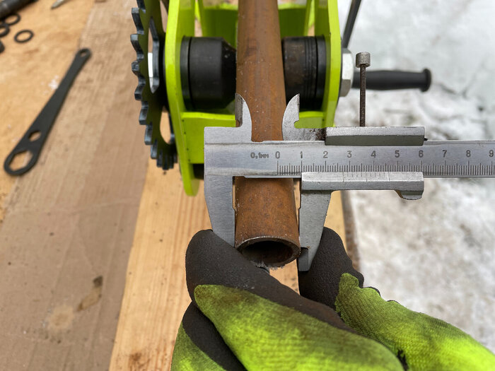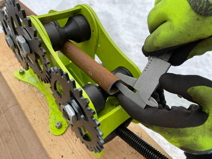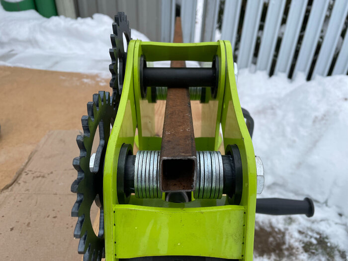 Валы вращаются с помощью ручки, она, кстати, переставляется, так можно менять радиус вращения в зависимости от того, с какими трубами работаете. Грамотное решение.