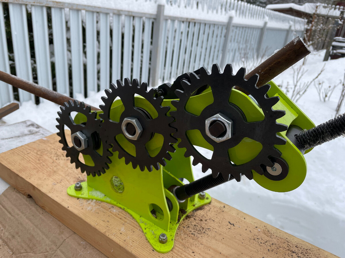 В уже собранном виде выглядит трубогиб так. Согласитесь, конструкция довольно необычная. Сразу вспоминаются фильмы, в которых гении Кулибины творили практически волшебство в своих мастерских! Вращаются какие-то хитрые механизмы, все движется, иногда искрится)))