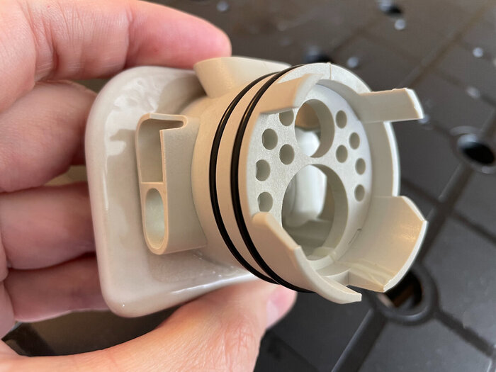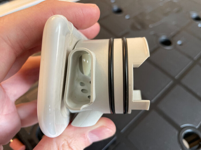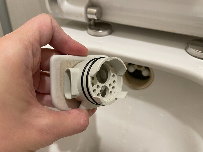 Как думаете, за счет чего рассекатель держится в отверстии чаши унитаза? За счет вот этих двух уплотнительных колец.