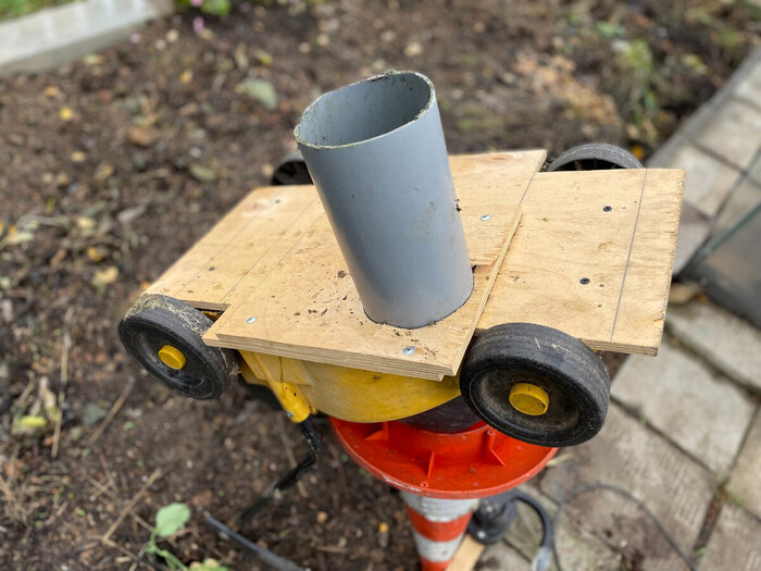 Плюс фанера с закрепленной в ней пластиковой канализационной трубой. В корпус газонокосилки добавлены деревянные бруски, чтобы можно было закрепить фанеру с помощью саморезов.