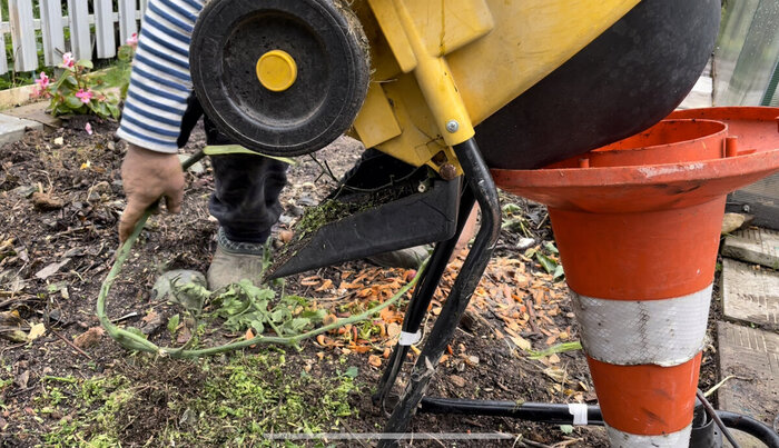 Включаем в сеть и закладываем ботву в эту трубу. Можно по одной ветке, а можно сразу несколько.