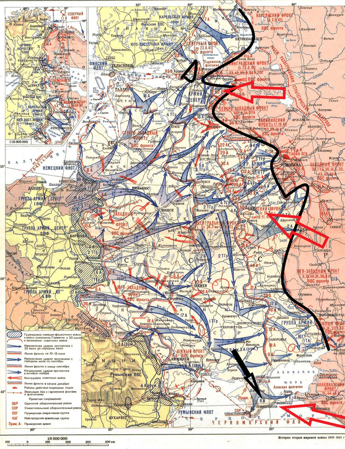 На картах красными стрелками обозначены основные удары советских войск, чёрными немецких и их союзников, голубыми направления основных событий на других театрах военных действий, жёлтыми границы отвоёванных территорий при наступлении той или другой стороны.