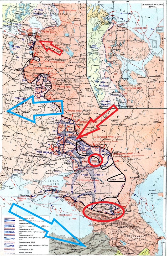 На картах красными стрелками обозначены основные удары советских войск, чёрными немецких и их союзников, голубыми направления основных событий на других театрах военных действий, жёлтыми границы отвоёванных территорий при наступлении той или другой стороны.