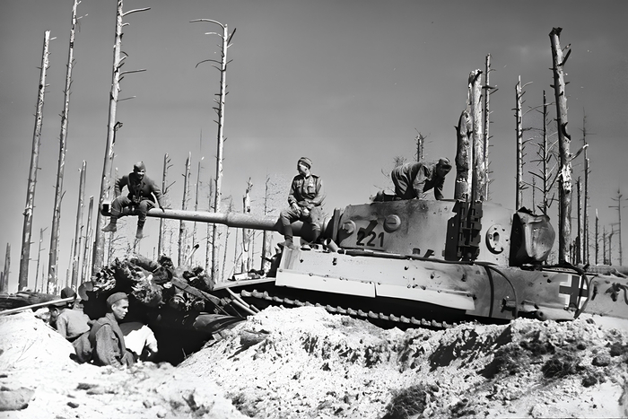 Советские танкисты на подбитом немецком танке после боя. Апрель 1944 года..
