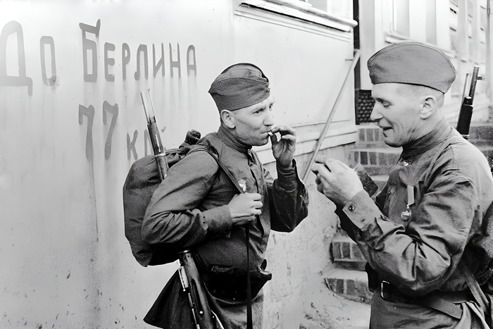 Советские солдаты перекуривают перед последним рывком - до Берлина. Апрель 1945 года..