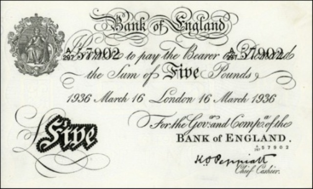 Фальшивая пятифунтовая банкнота, выполненная заключенными в рамках операции "Бернхард".