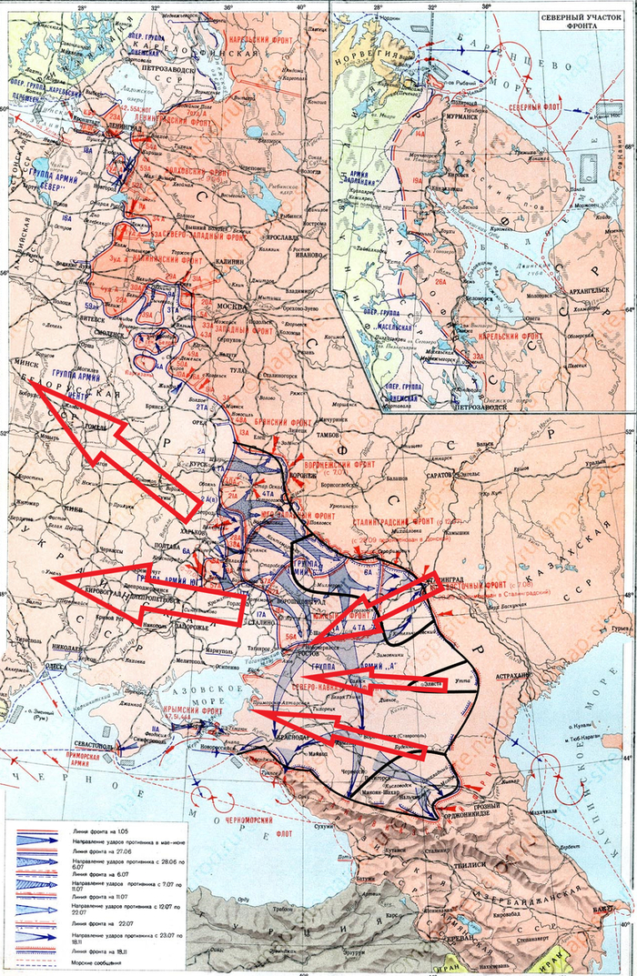 На картах красными стрелками обозначены основные удары советских войск, чёрными немецких и их союзников, голубыми направления основных событий на других театрах военных действий, жёлтыми границы отвоёванных территорий при наступлении той или другой стороны.