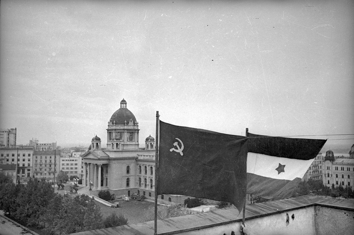 Военные с флагом Югославии на крыше Скупщины. Дата съемки: 1945 год