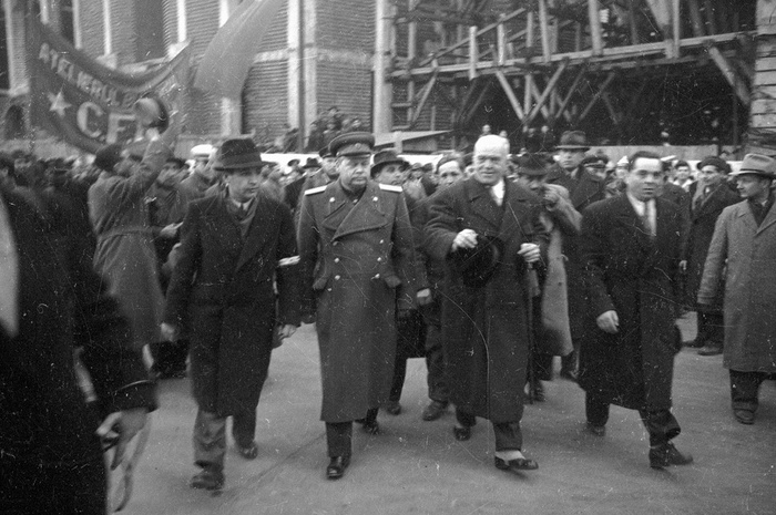 В центре – член Политбюро и секретарь ЦК РКП Анна Паукер, рядом – комендант Бухареста генерал-майор Петр Москвитин, справа – премьер-министр Петру Гроза.