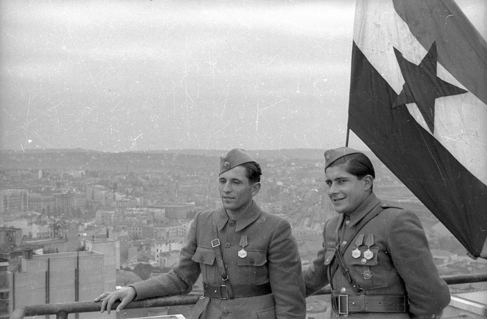 Флаги СССР и Югославии над городом. Дата съемки: 1945 год