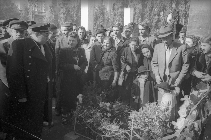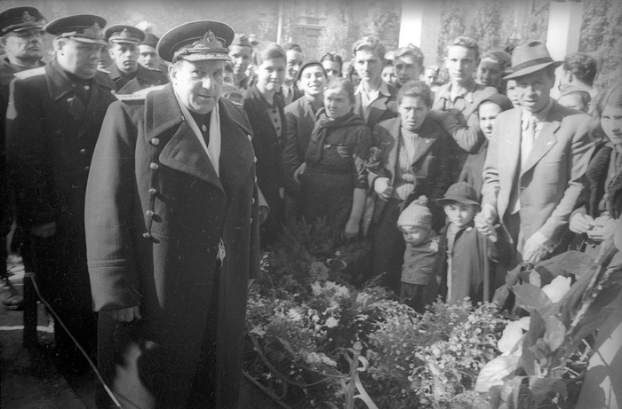Контр-адмирал Георгий Холостяков у захоронений советских воинов. Дата съемки: 1945 год.
