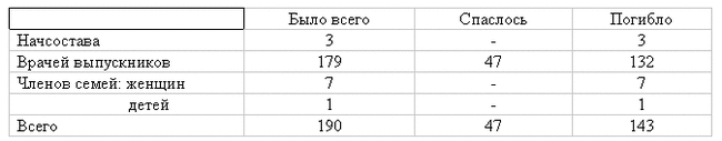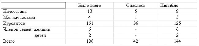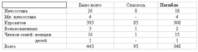 В итоге происшедшей катастрофы погибло не менее 900-1000 человек. По отдельным училищам цифры о погибших и спасенных показывают следующее:
