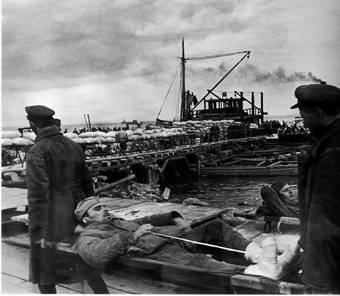 И вот вдали увидели корабль. Появилась надежда. Появились планы, как спасать людей…Подняли белую простыню на палке. Идут минуты, десятки минут, часы…., а корабль не хочет нас замечать. И, видимо, командир видит в бинокль и артиллерист в свои приборы, как гибнут сотни людей в холодной ладожской воде. Баржа разваливается. Появились плоты. Начинается отчаянная борьба за жизнь. Плывут голые, одетые, на бревнах, досках к буксиру, надеясь там найти спасение. Подплываю на плоту к буксиру. Матросы из команды бросают концы. За них цепляются, как за жизнь, и карабкаются на палубу. Матросы помогают выбраться через леера. Идет ловля людей из холодной ладожской воды. Появились «мессершмитты». Буксир ощетинился пулеметным и винтовочным огнем. Команда спасает плавающих и отбивает налет самолетов.