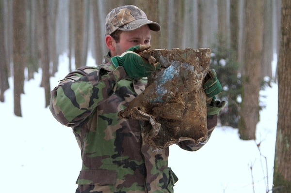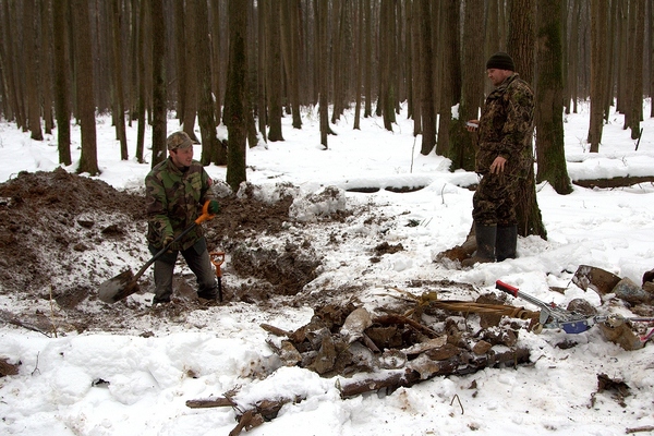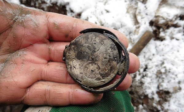 В ходе углубления в воронку стали попадаться фрагменты кожаной одежды, свитера, поясного ремня и части летного планшета, что в сумме с парашютными стропами могло говорить о том, что летчик погиб в самолета на этом месте.