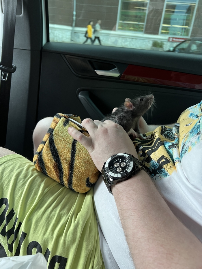 Вот все говорят, крысам нужно выгуливаться и всё такое, а мы на выгуле не хотим гулять, просимся домой, залезаем на руки, или сидим в домике. А когда гуляем по комнате, шкеримся по углам и за шкафы. Такой вот характер.