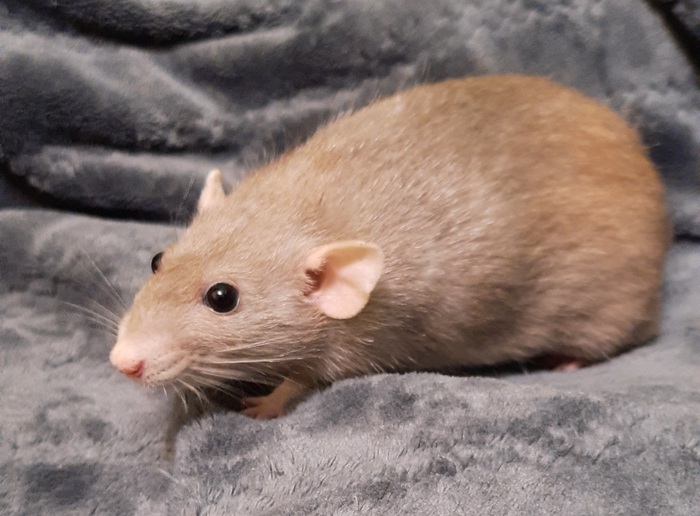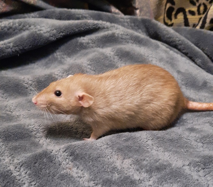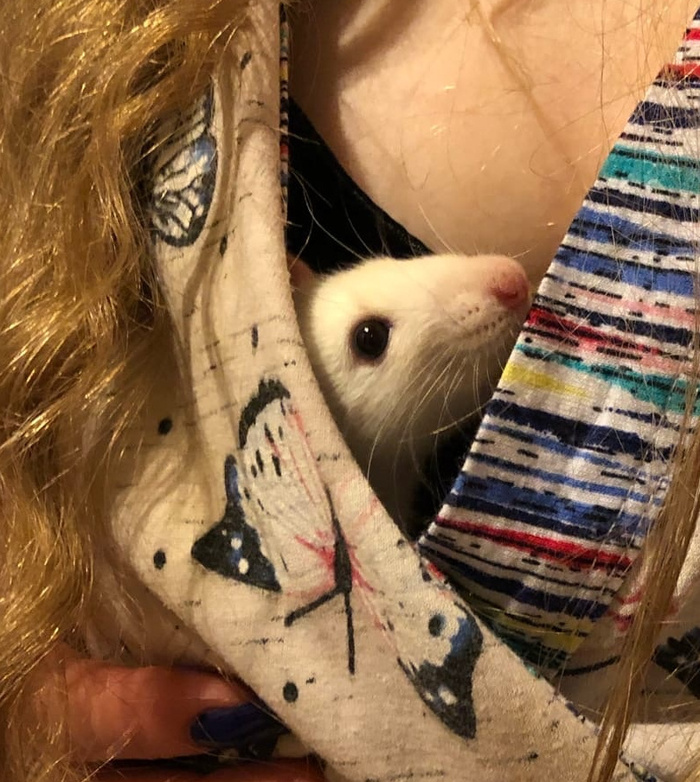 Трисс на момент изъятия с лестницы была совсем крысенком. Она нереально доверчивая и активная. Правда, на второй день дома она меня очень напугала, когда после ингаляции Беродурала словила белку и начала метаться по комнате так, словно за ней черти гонятся. Когда я поймала ее, чтобы успокоить, она попыталась осуществить мою мечту о проколотых сосках, благо зубки были еще маленькие, и она не смогла прокусить даже футболку. Но орала я громко и нецензурно. Это был первый и единственный раз, когда она проявила хоть какое-то подобие агрессии. Максимум, что она может сделать - зализать до смерти.