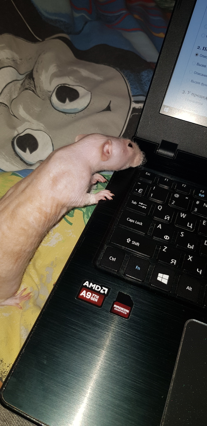 Зато в спальне она носится как электровеник. Очень любит лазить по моей полке с духами, видимо, ей там вкусно пахнет. А еще они до сих пор ничего не погрызли, кроме еды и специального камня, что удивляет, потому что обычно крысы перерабатывают гамаки на кружева в среднем за три дня.