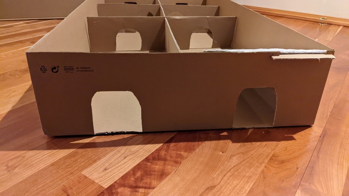 Образовались тут у меня большие картонные коробки, а у крыс как раз старая выгульная коробка от телевизора уже совсем истрепалась. Решил построить им крысобастион. Работа в процессе, но, хочу показать, что тут у нас намечается. Это первый этаж, размеры - примерно 1.2 м на 50 см: