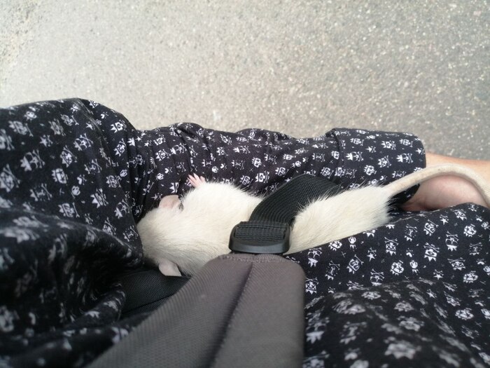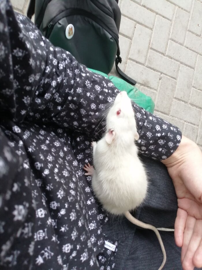 Мне повезло - крыс пошёл на руки, не кусался и вообще с комфортом бегал по мне, исследуя руки и рюкзак. Но что с этим чудом делать?
