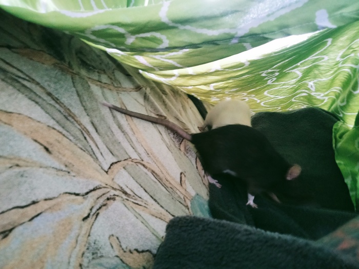 Фотка сделана давно, еще когда крысы влезали в одноразовые картонные домики, которые я делал для них. Кстати, если кому нужна выкройка домика, могу выложить в следующем посте. Для молодых неписяющих и не сильно грызущих крыс такие домики очень неплохо подходят.