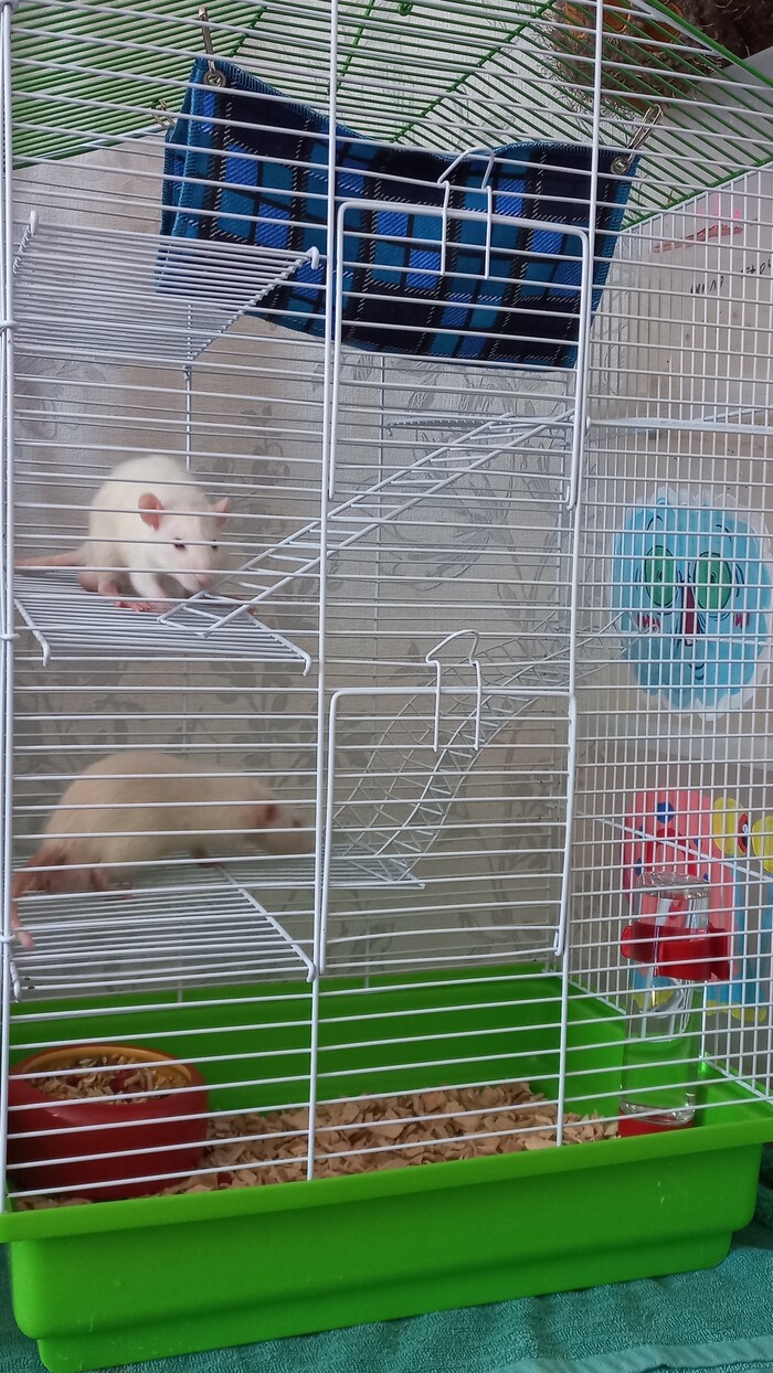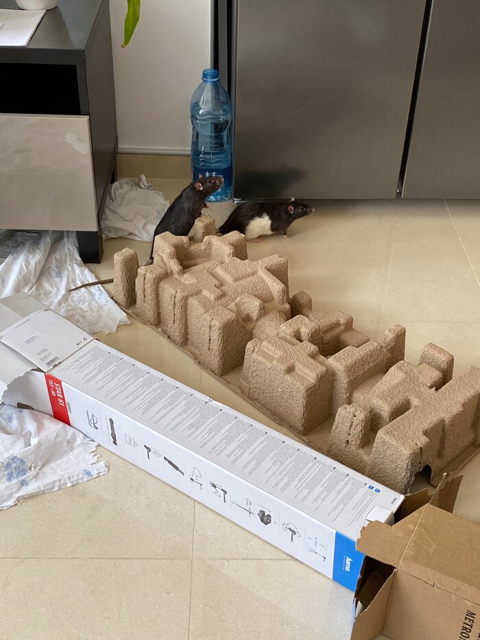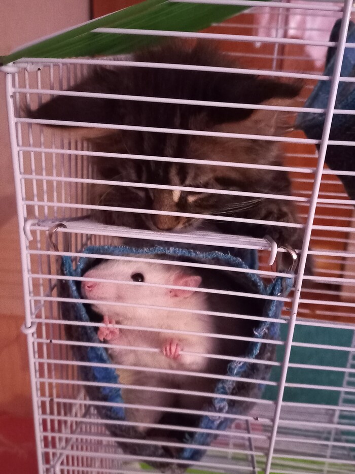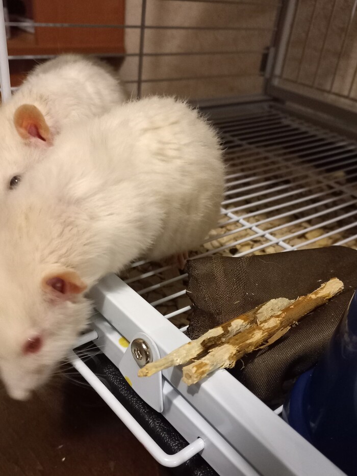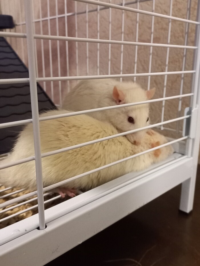 Год жизни крысят. Взяли с женой после свадьбы и дома до сих пор топот маленьких крысьих лапок. "Пухляш" c красными глазами, "Бандит" с чёрными. Имена полностью описывают их характер. В свободное время тянут канат и точат копья для нападения на кота. Когда были маленькими и молодыми с удовольствием бегали по дивану и клетке со сверхзвуковой скоростью. Даже были попытки побега со стола, чтобы исследовать всю квартиру. А сейчас уже на пенсии и ведут тихую и размерную жизнь.
