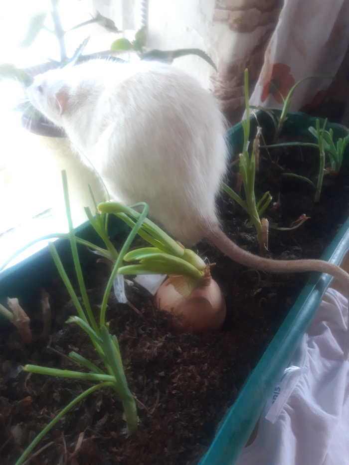 Это мой крысик Монстр, гулял по столу и нашел что то интересное в ящике с луком. Имя у него конечно своеобразное, но назвала дочь, говорит в честь энергетиков Монстр и Горилла. Второй не попал на фото потому что сейчас в клетке, когда они были мелкими отлично ладили и жили в одной клетке, а последние пол года стоит им оказаться рядом тут же начинают драку, пришлось рассадить. Теперь гуляют по очереди.