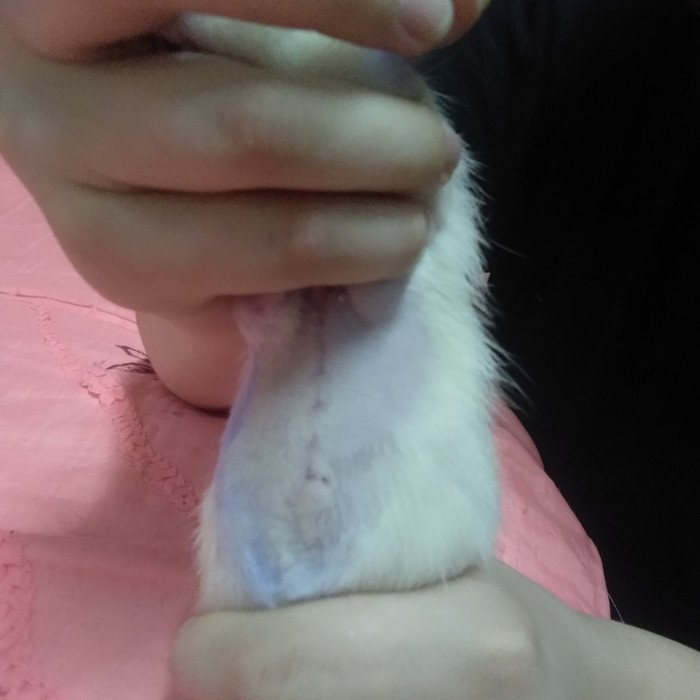 Девчонка ну оочень активная, носится по выгулу, жрет всё, что не приколочено (а что приколочено – отрывает и тоже жрет). Все фото смазаны, так как зафиксировать её в неподвижном состоянии очень сложно. Будем надеяться, что рецидива не произойдёт, хоть это и маловероятно. Ну а пока она будет ходить вот такая – местами лысая, местами синяя и со шрамом на всю себя :)